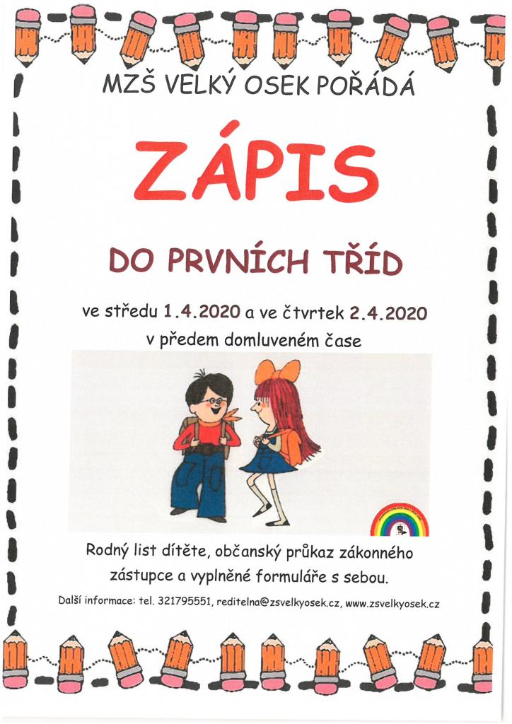 Masarykova základní škola Velký Osek pořádá zápis do prvních tříd ve středu 1.4.2020 a ve čtvrtek 2.4.2020. Více informací naleznete v příloze.