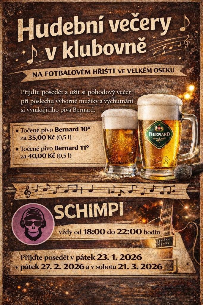 Zveme vás na příjemné posezení v klubovně na fotbalovém hřišti Velký Osek, kde si můžete užít klidnou atmosféru a společnost ostatních. Akce je určena pro všechny, kteří si chtějí odpočinout a strávit čas v příjemném prostředí s hudebním doprovodem.