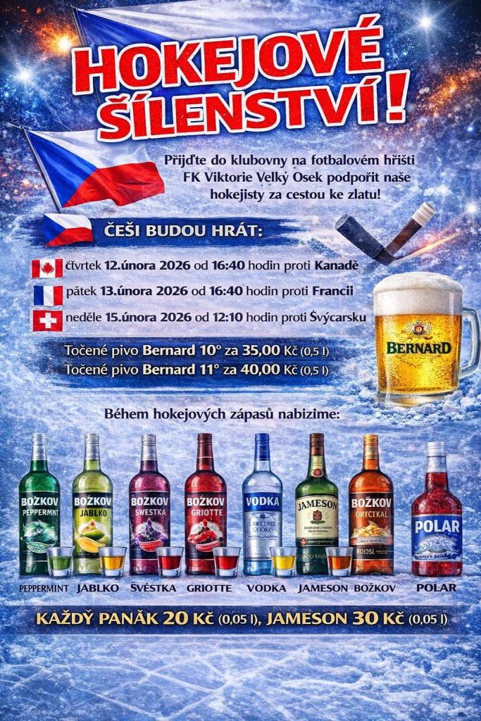Přijďte do klubovny na fotbalovém hřišti FK Viktorie Velký Osek podpořit české hokejisty na cestě za zlatem.