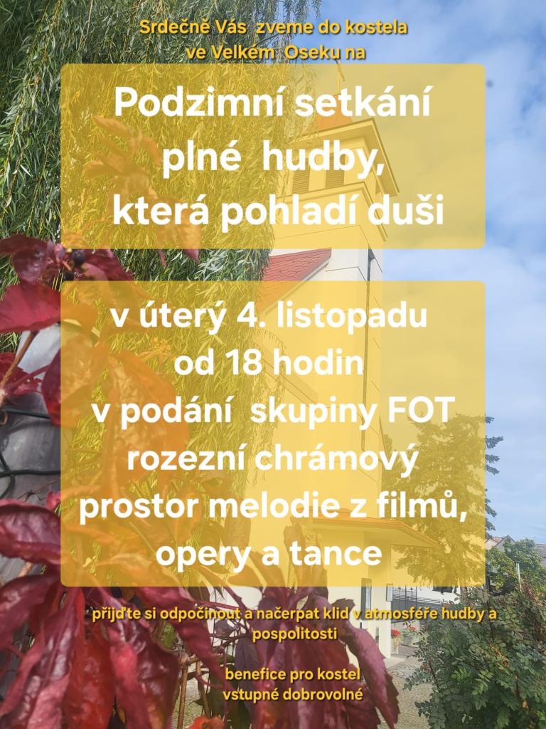 Zveme vás do kostela ve Velkém Oseku na podzimní setkání plné hudby, které se uskuteční 4. 11. 2025 od 18:00 hodin. Skupina FOT rozezní chrámový prostor svými melodiemi z filmů, oper a tance.