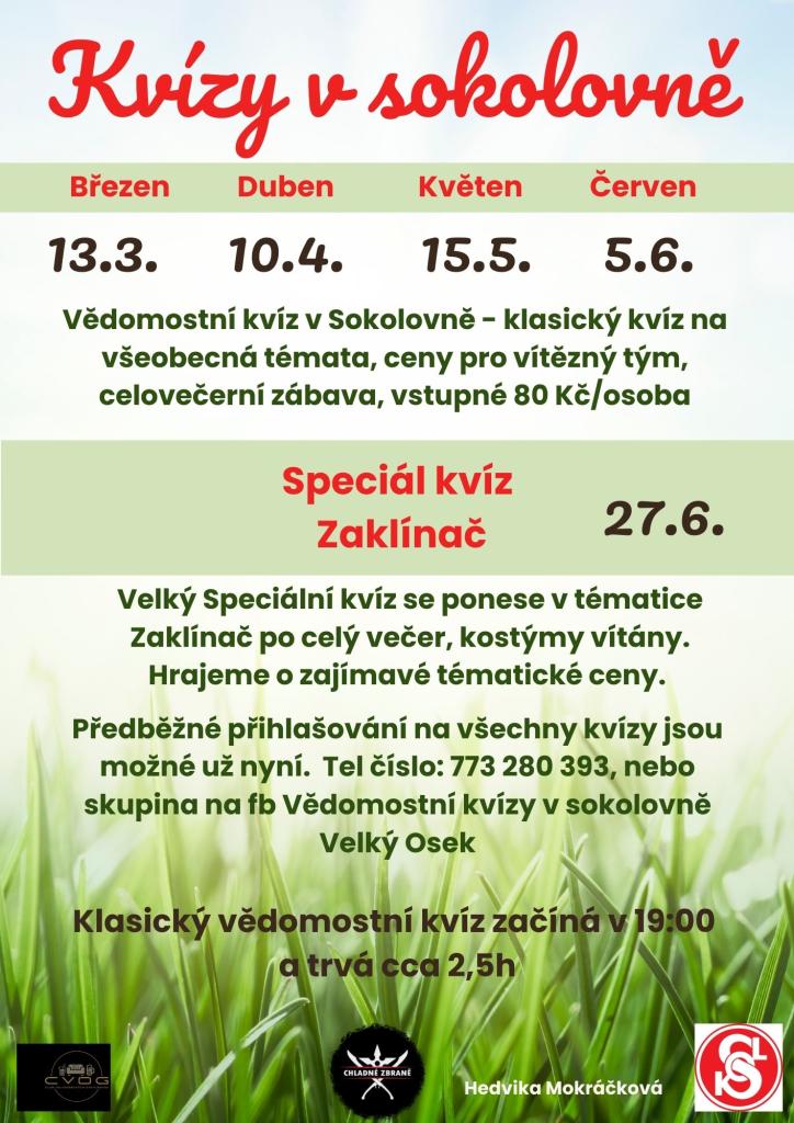 Přijďte si prověřit své znalosti na různá témata a vyhrajte ceny pro vítězný tým. Akce slibuje celovečerní zábavu, kterou si nesmíte nechat ujít. Vstupné je 80 Kč za osobu a předběžné přihlašování je možné již nyní na tel. č. 773 280 393 nebo na fb Vědomostní kvízy v sokolovně Velký Osek.