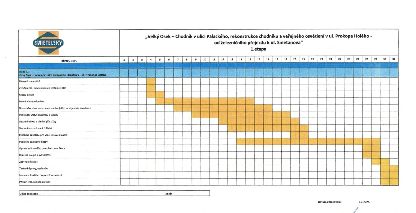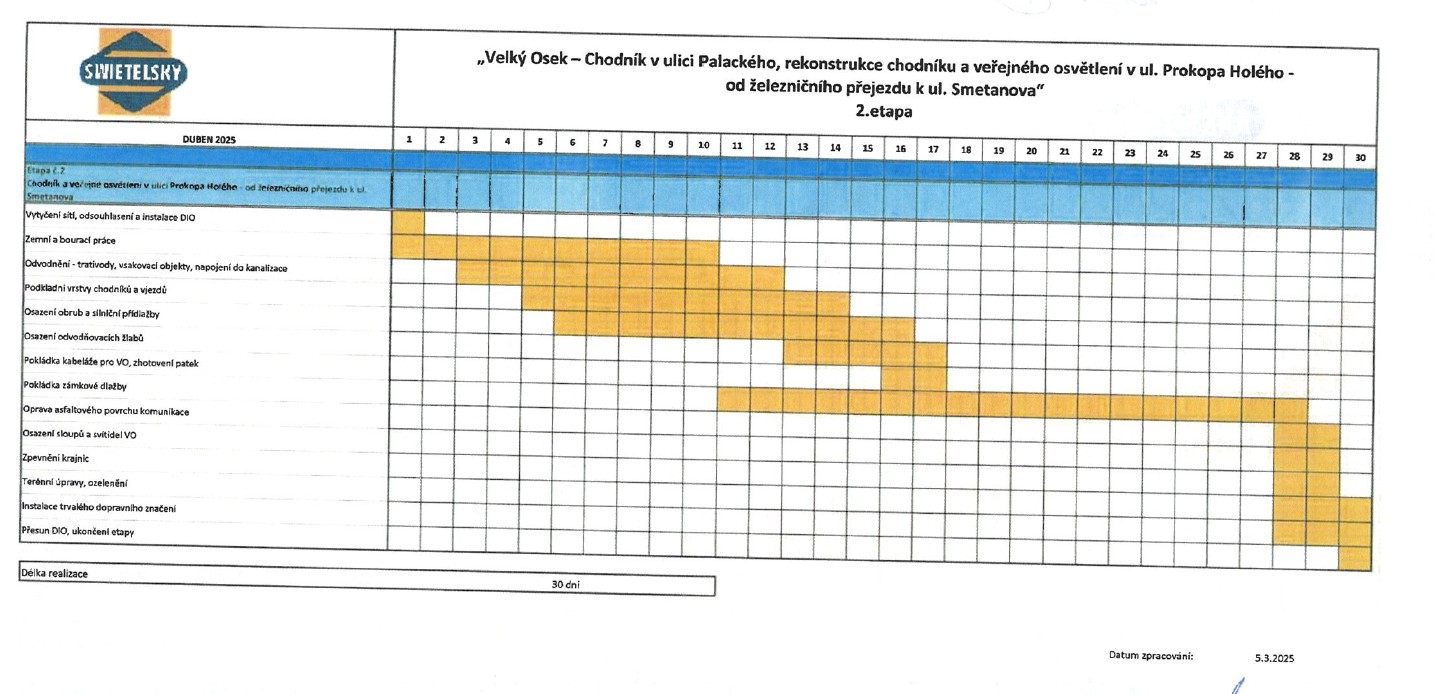 Předpokládáný harmonogram prací (může být ovlivněn zejména počasím) naleznete v přílohách.